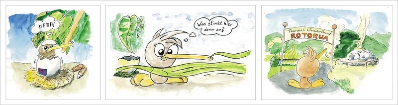 Als Promotion für die Buchmesse entstand jede Woche eine Geschichte, in der ein kleiner Kiwi sein Heimatland bereist und die Besonderheiten erlebte.